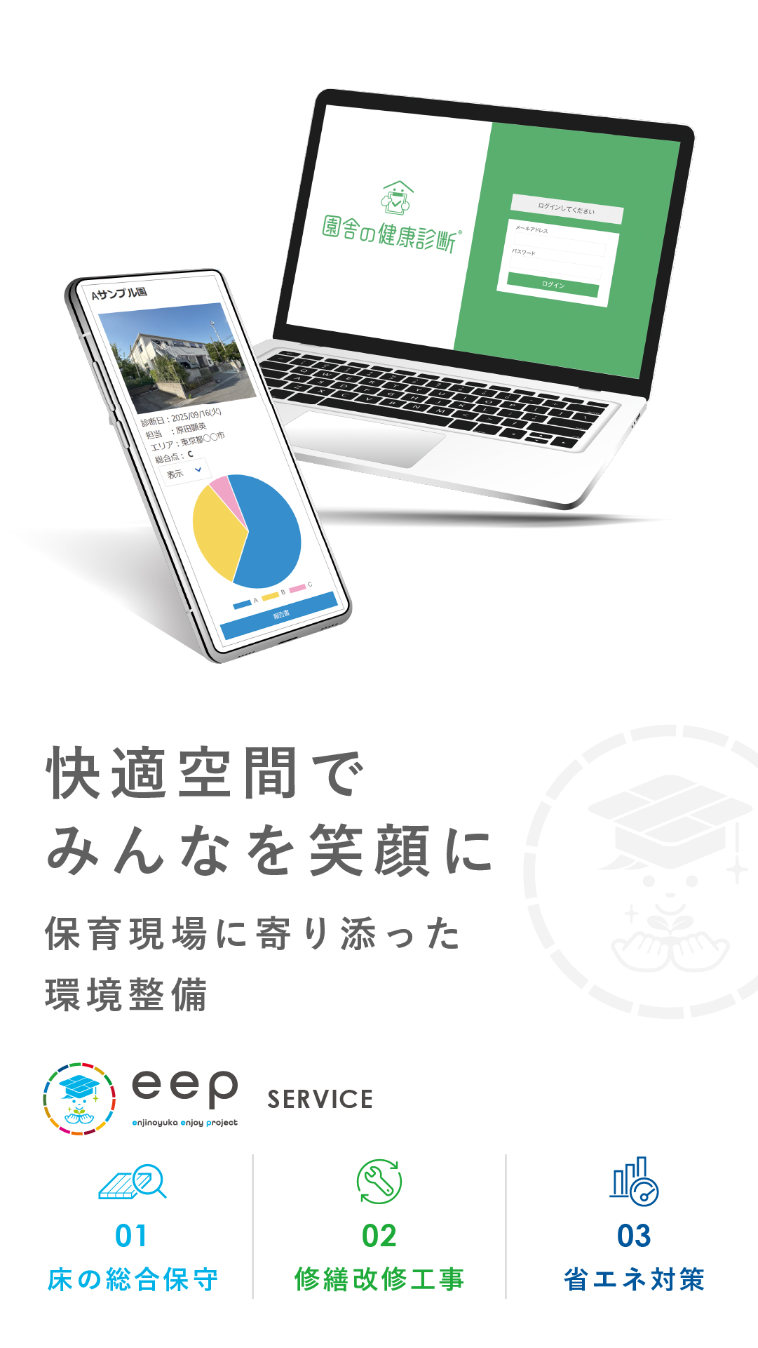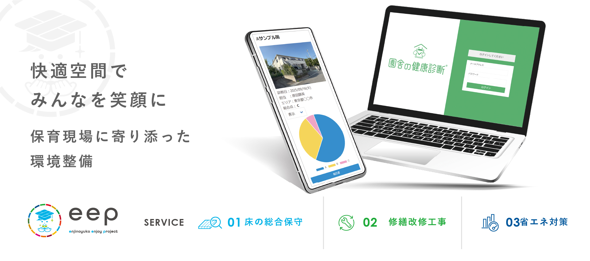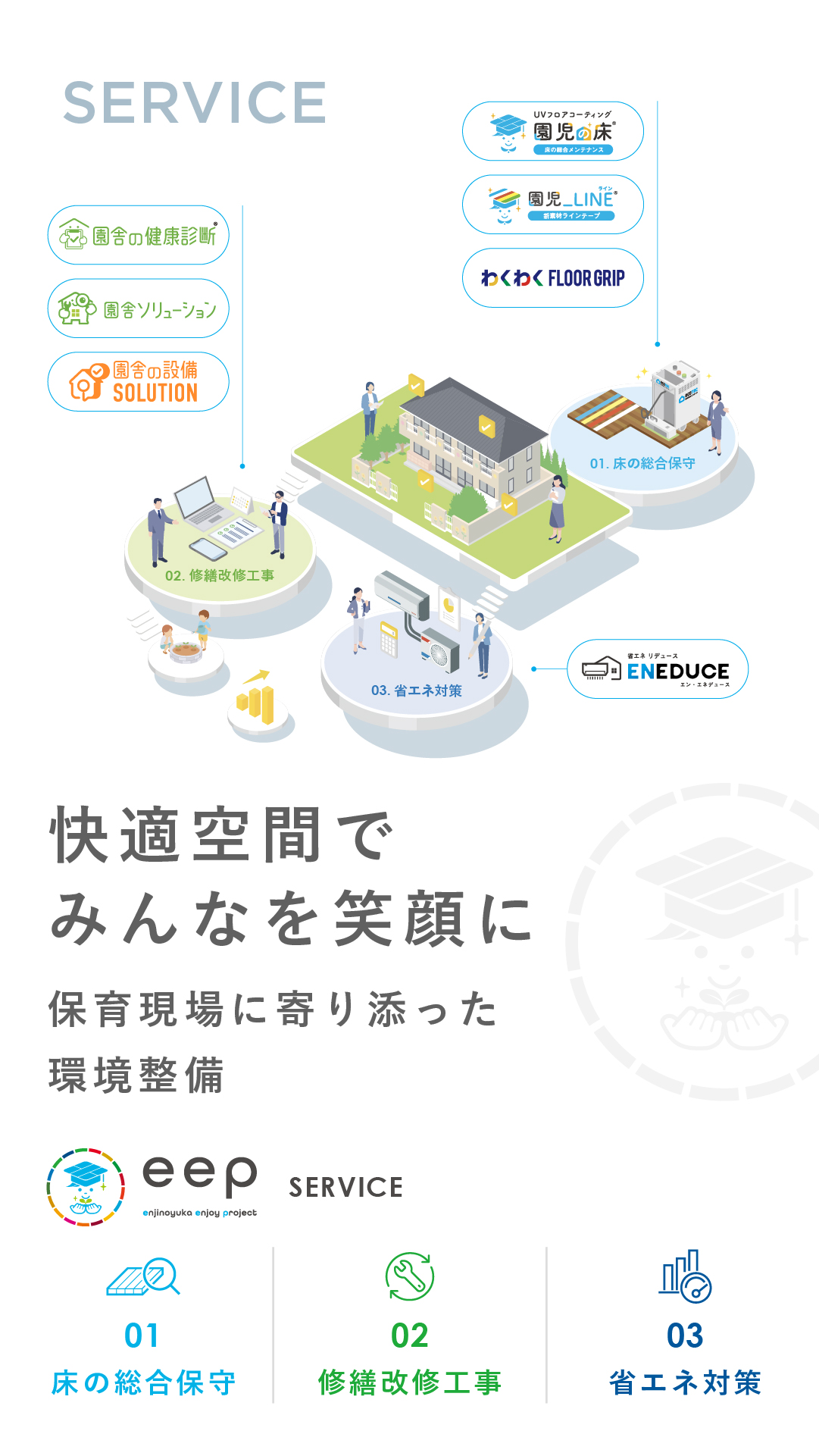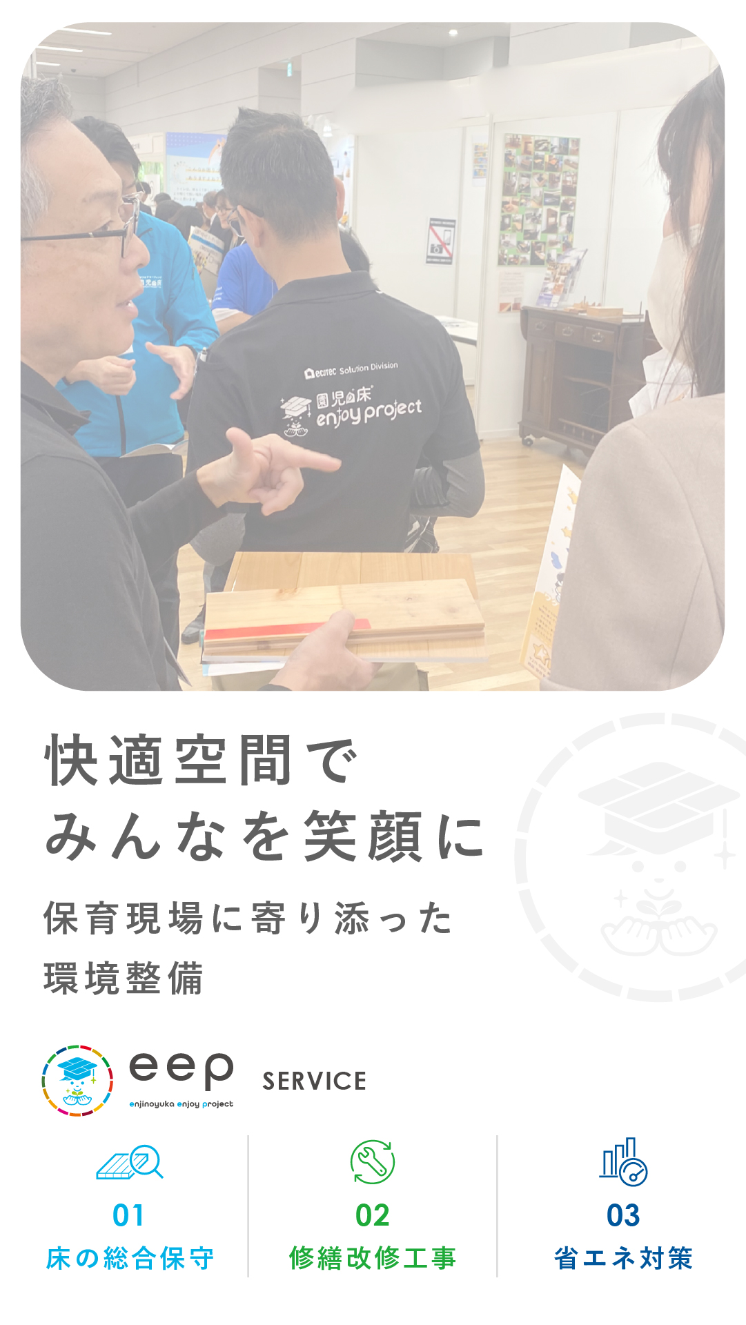eep(園児の床 enjoy project)全国の保育事業者様の運営負担軽減とメンテナンスコスト軽減を掲げ、2021年8月より「園児の床®︎」を主力商品とした、保育環境の 床総合メンテナンス事業として開始しました。その他、「修繕改修工事」「省エネ対策」など、主に3つのサービスを展開しています。