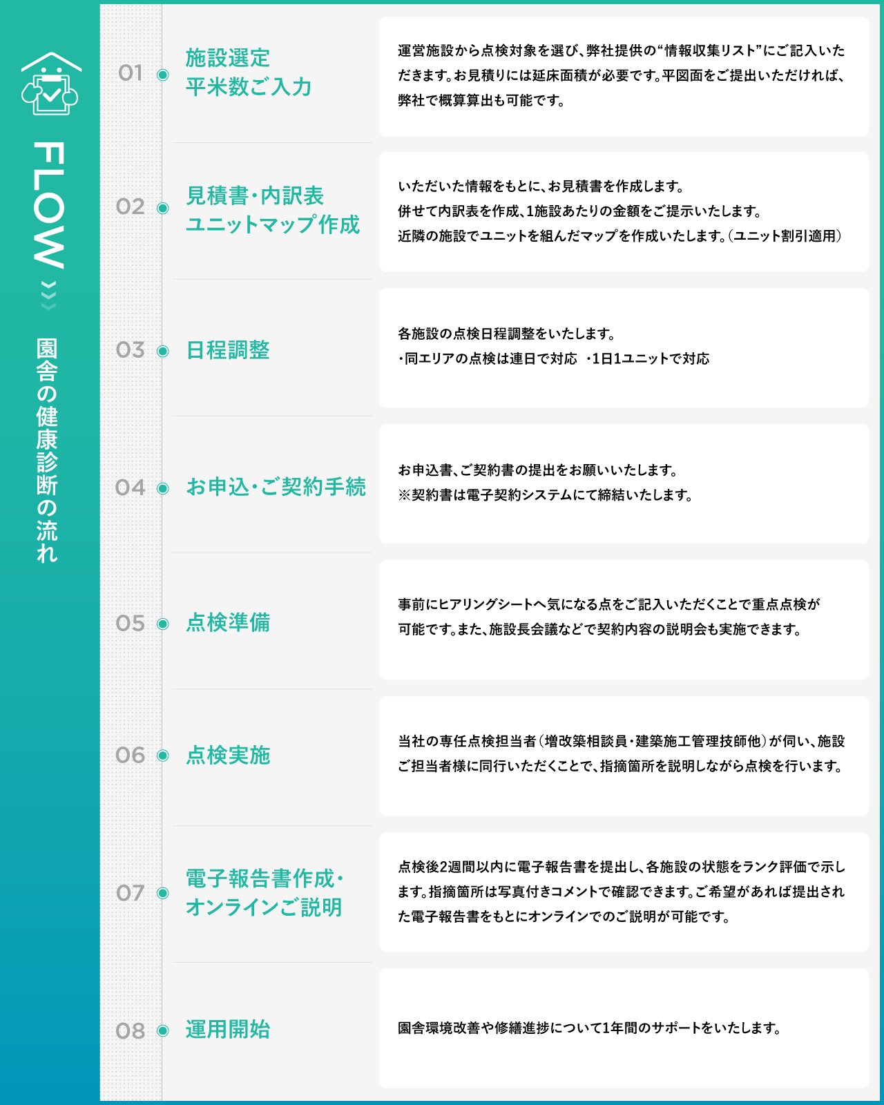 弊社スタッフが保育園、幼稚園、こども園に対して、内外装定期点検を実施します。点検は1時間ほどで終了します。