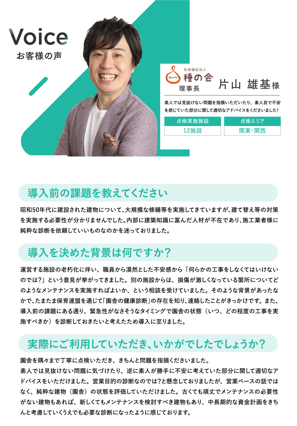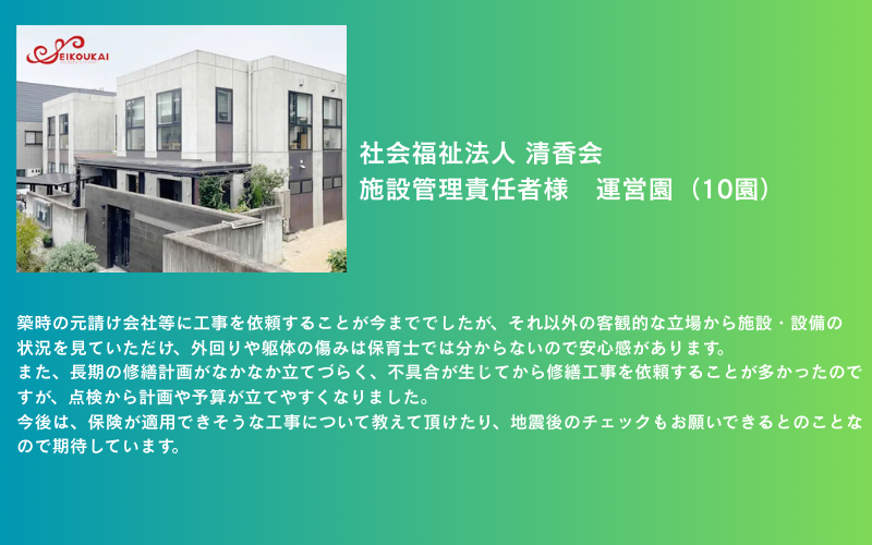 我々が、保育現場の安全環境を守るために積極的な園舎の内装・外装の点検を行い、第三者目線の気づきとして、園舎の現状を知っていただきたいです。